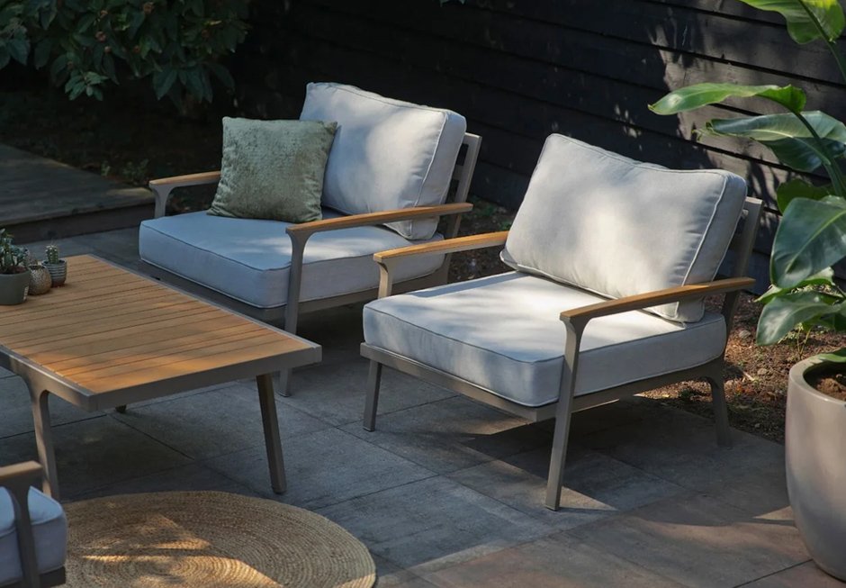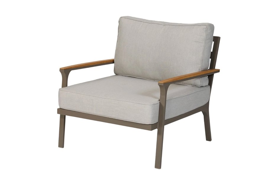 Aluminum armchair with cushion and armrests made of teak wood. Available in dimensions 89x75x82h cm.