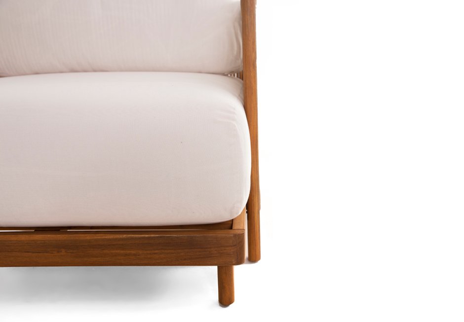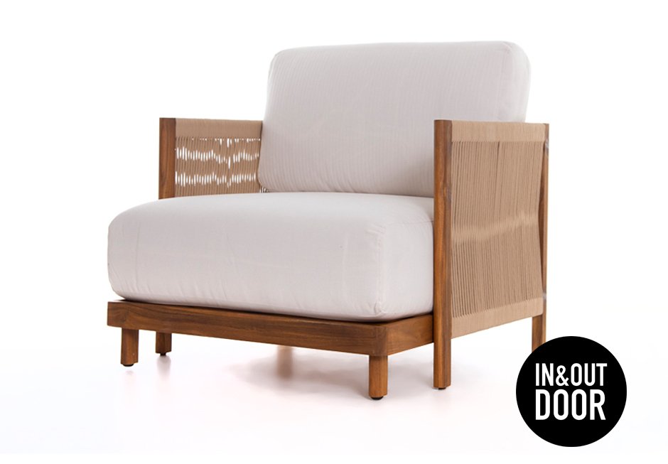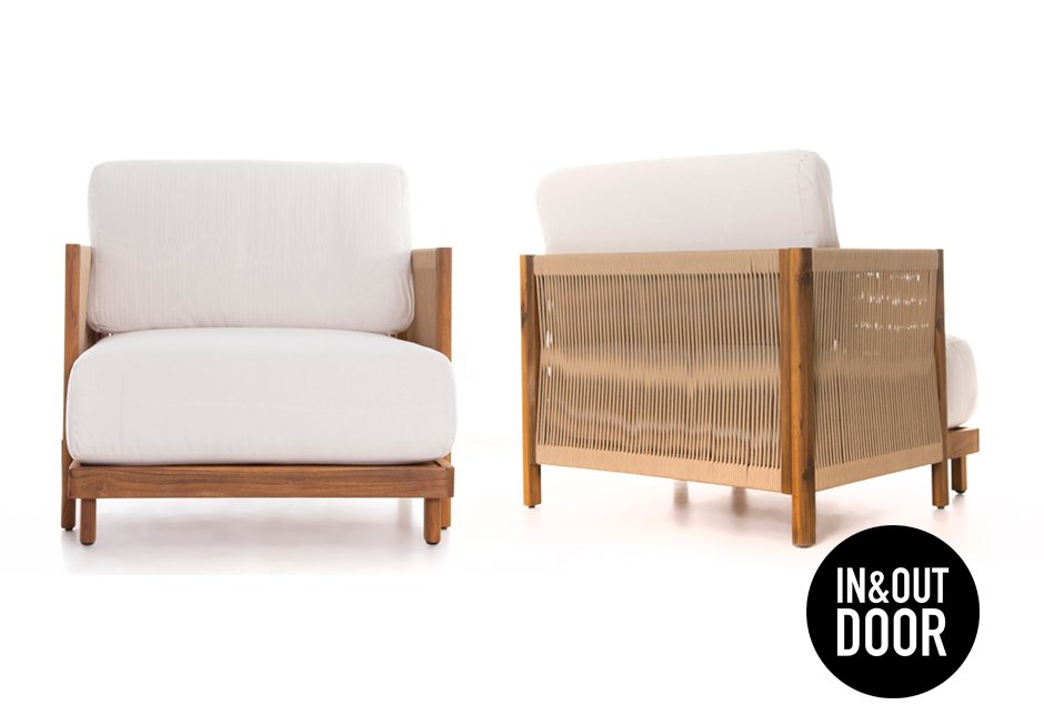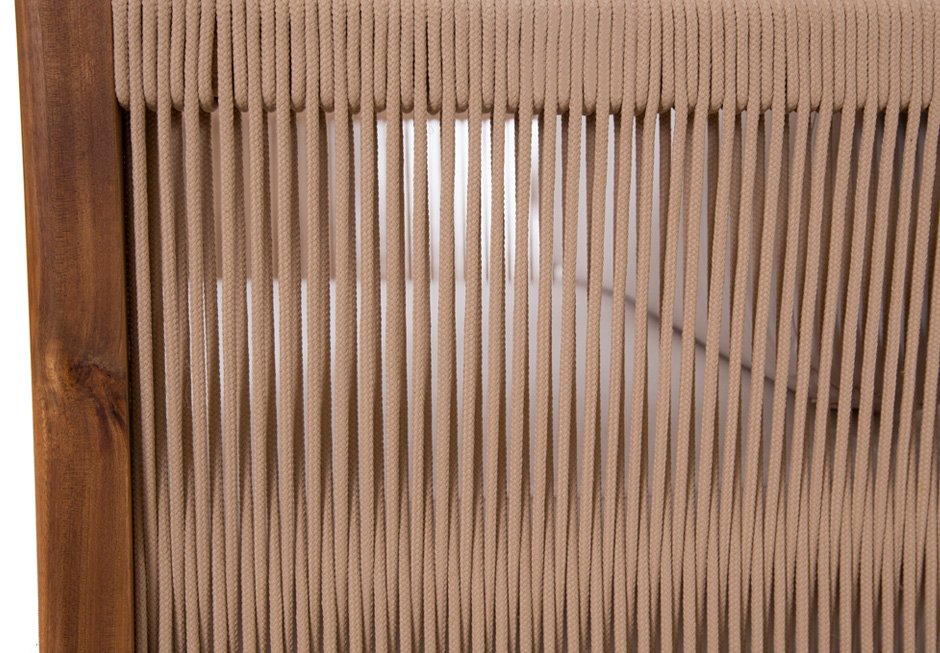 Indoor and outdoor armchair with cushions, made of acacia wood and knitted in the seat. Available in dimensions 81x79x60h cm.
