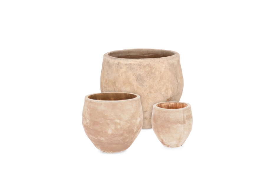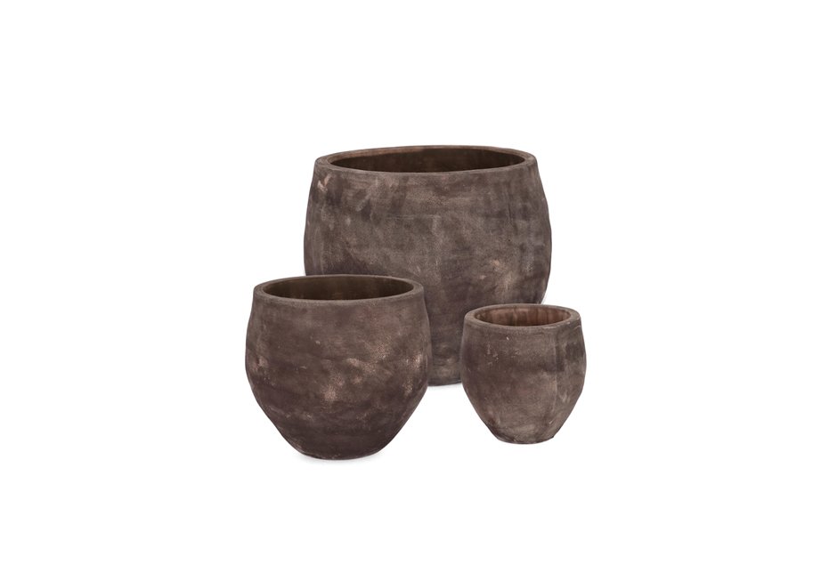Outdoor vases (set of 3) made of terracotta with a hole at the bottom in dark and natural shade. Available in dimensions Ø22x22h cm, Ø32x29h cm and Ø42x38h cm.
