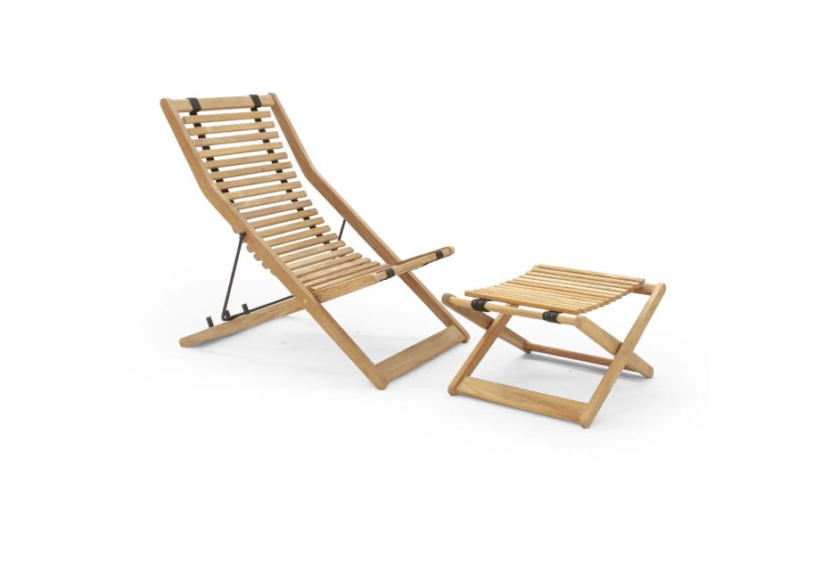 Beach chair made of teak wood in dimensions: 130x66x96cm. Footrest is also available in dimensions: 58x51x34cm.