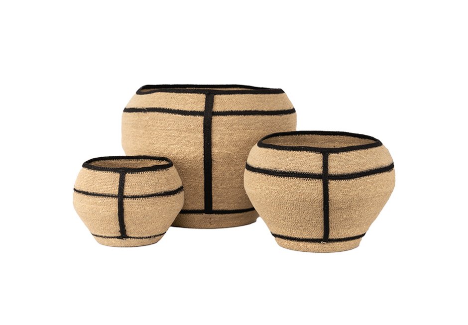 Διακοσμητικά καλάθια (σετ των 3) από φυσικά υλικά με μαύρες λεπτομέρειες.