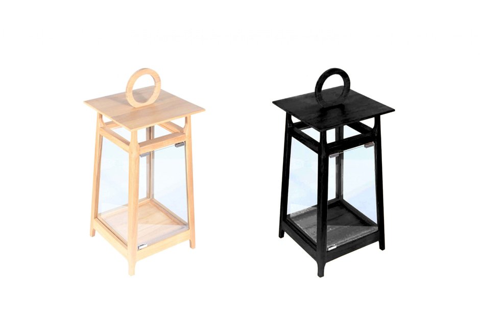 Διακοσμητικό κηροπήγιο φανάρι δαπέδου από ξύλινο σκελετό σε φυσική και μαύρη απόχρωση.