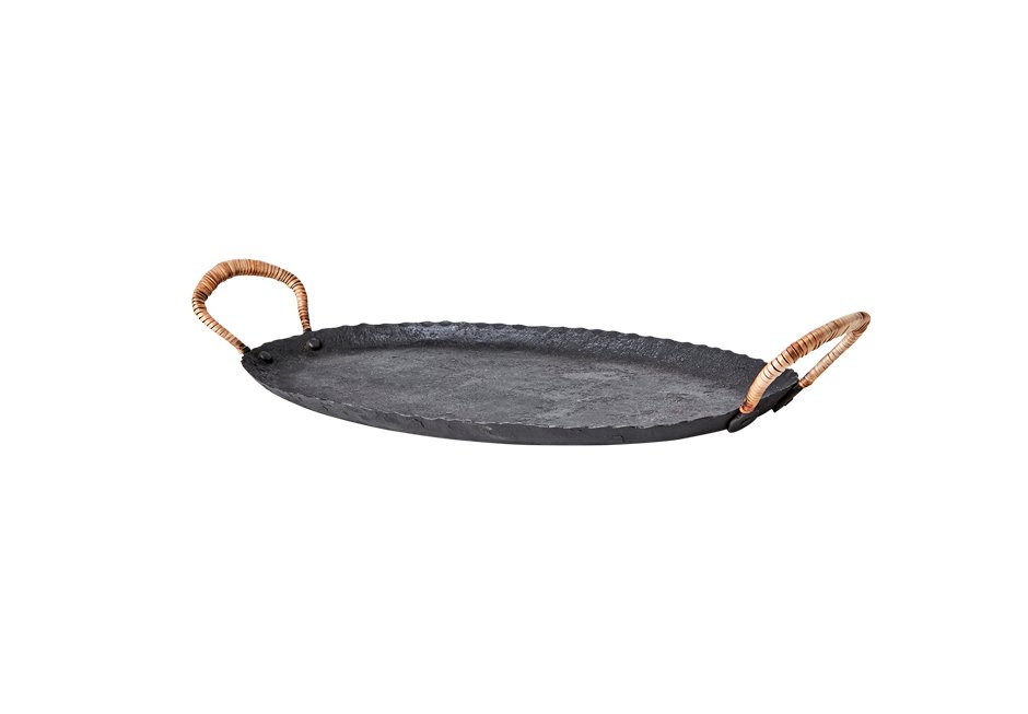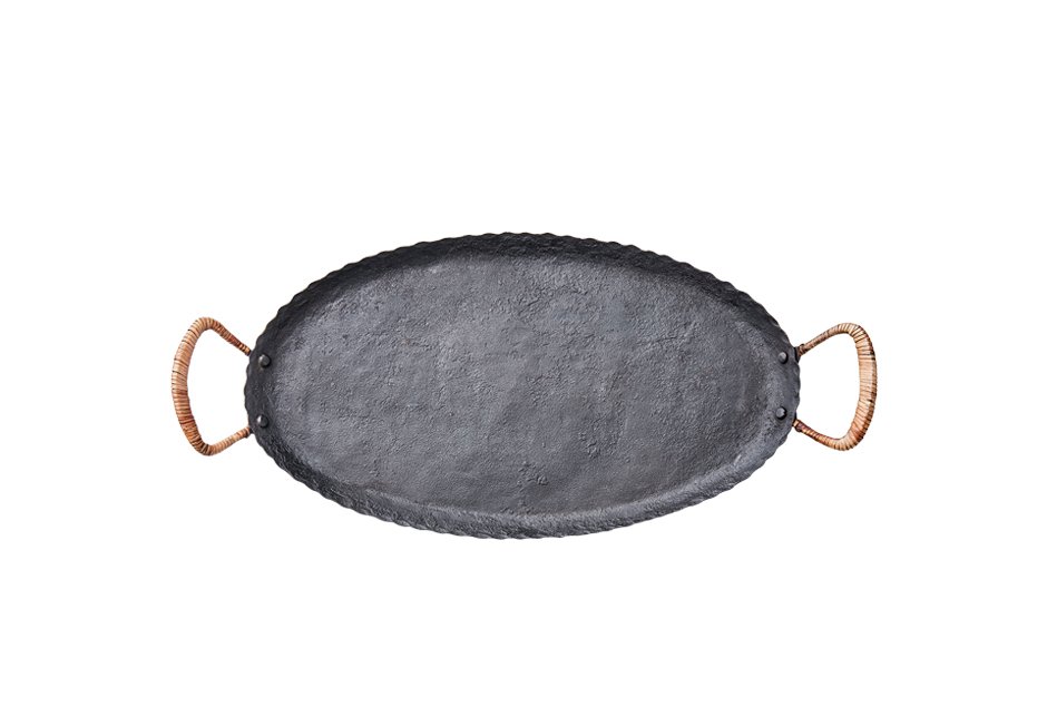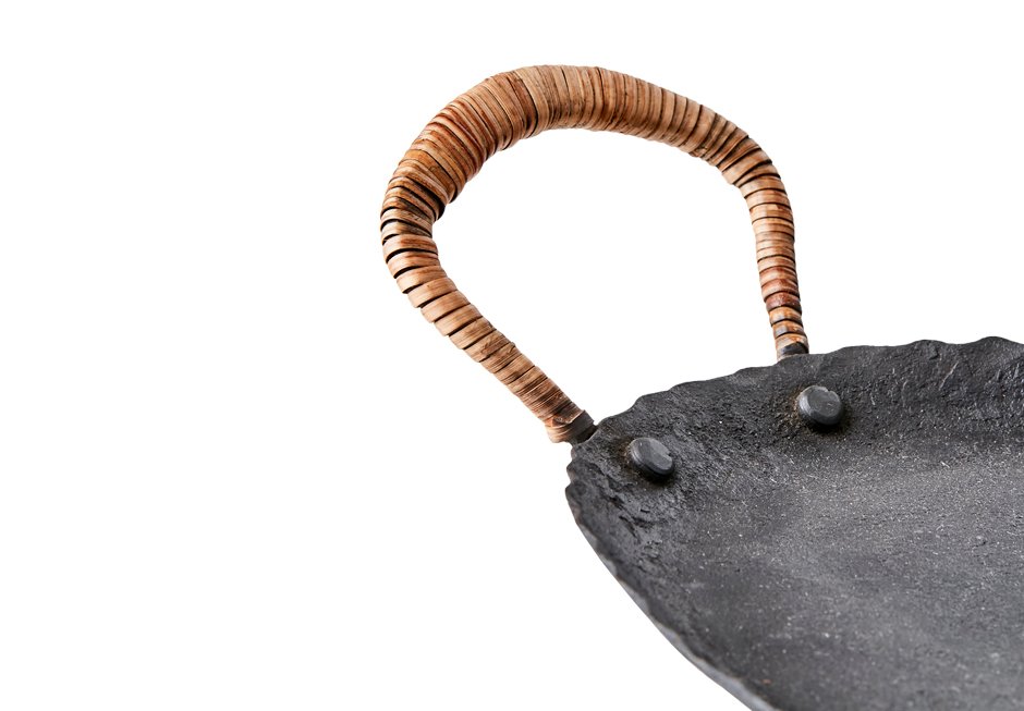 Μαύρος μεταλλικός δίσκος και χερούλια με πλέξη από rattan.