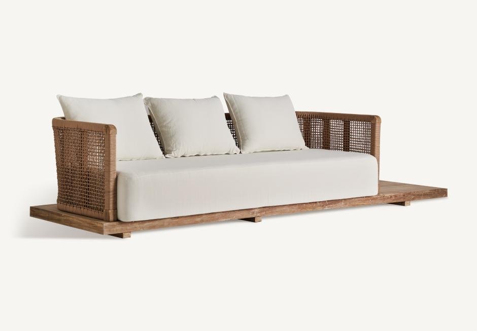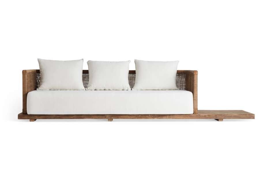 Καναπές από ανακυκλωμένο ξύλο teak. Διατίθεται σε διαστάσεις 320x90x70h cm, σε μπεζ και λευκό χρώμα.