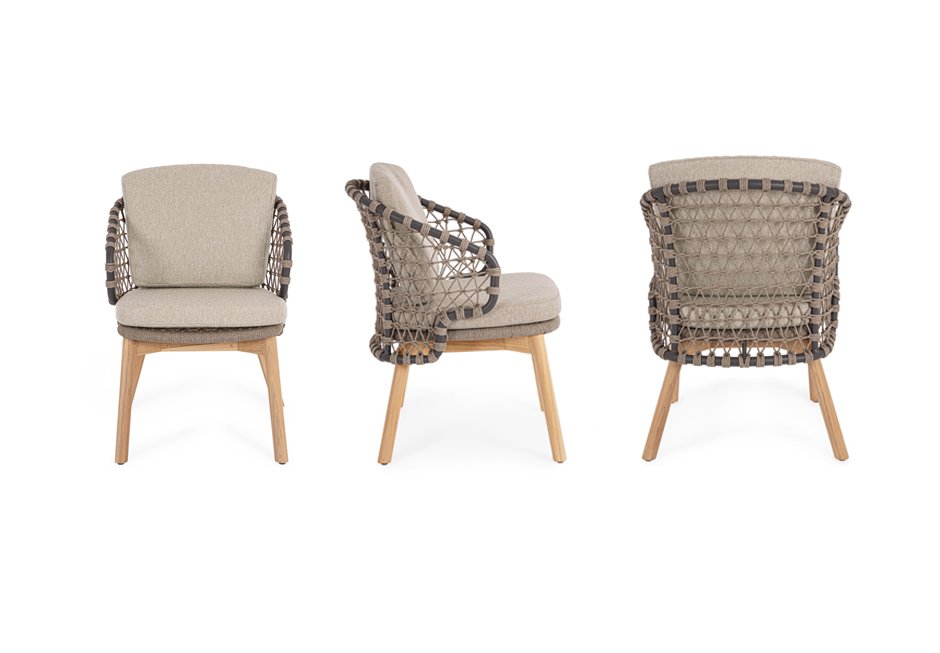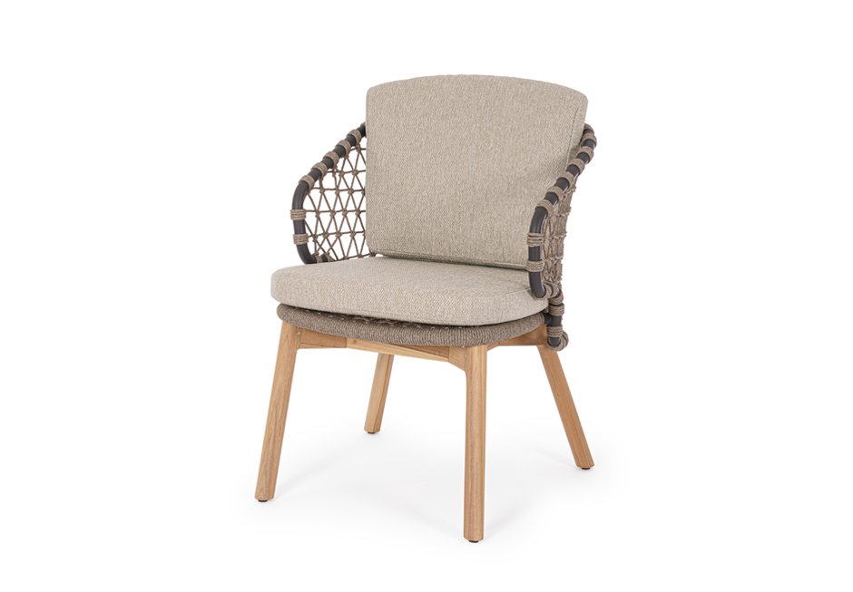Καρέκλα εξωτερικού χώρου με σκελετό αλουμινίου, βάση από ξύλο teak και πλεκτό κάθισμα από σχοινί. Διατίθεται σε διαστάσεις 61,5x69x83,5h cm, με ύψος καθίσματος 48 cm.