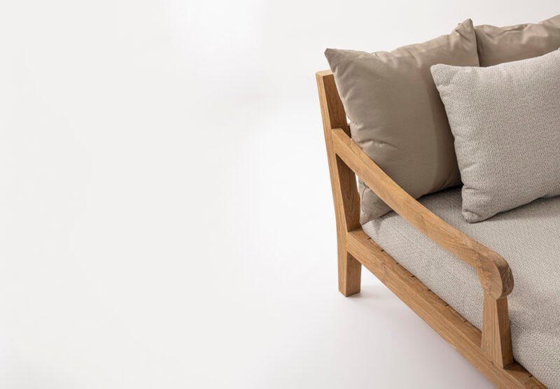 Ξαπλώστρα/Κρεβάτι με μαξιλάρι, από ξύλο teak. Διατίθεται με ένα μπράτσο είτε αριστερό είτε δεξί και με ύφασμα σε natural, aqua, και wine απόχρωση. Διατίθεται σε διαστάσεις 206x87x72h cm.