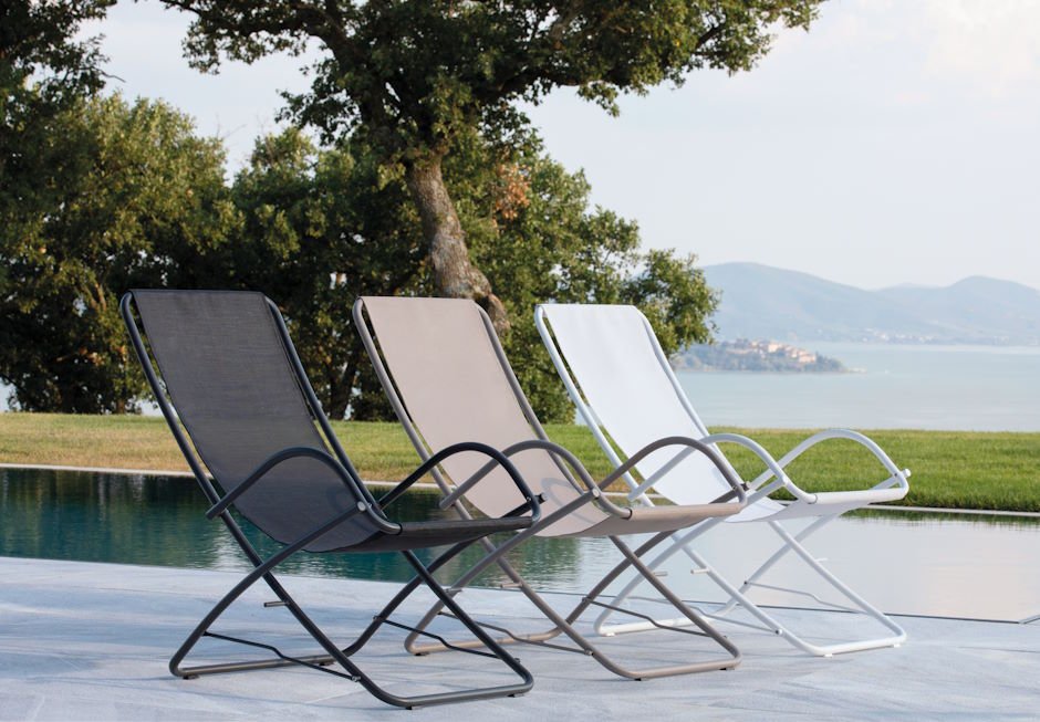 Ξαπλώστρα με μεταλλικό σκελετό. Διατίθεται σε διαστάσεις: 64×97,5x93h cm, σε ποικιλία χρωμάτων.