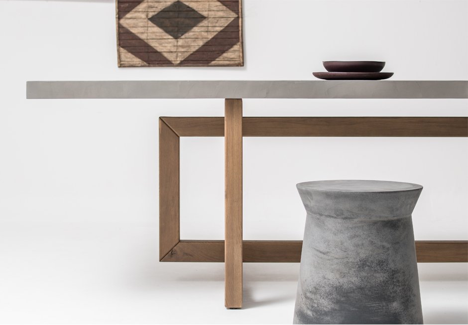 Τραπέζι με επιφάνεια από τσιμεντοκονία και βάση από μασίφ ξύλο. Διατίθεται σε διαστάσεις 280x100x78h cm.
