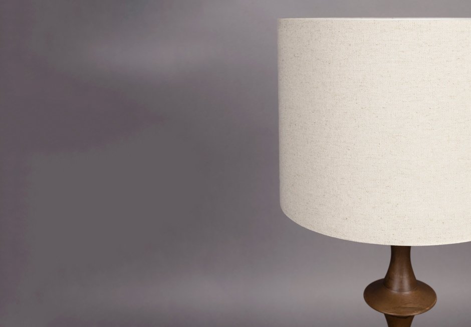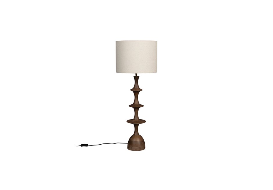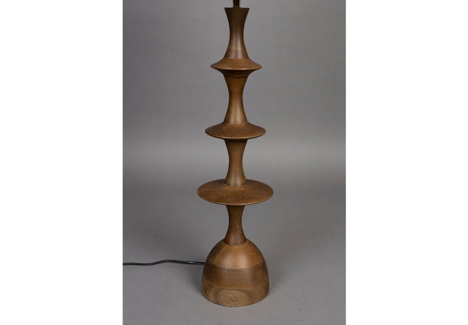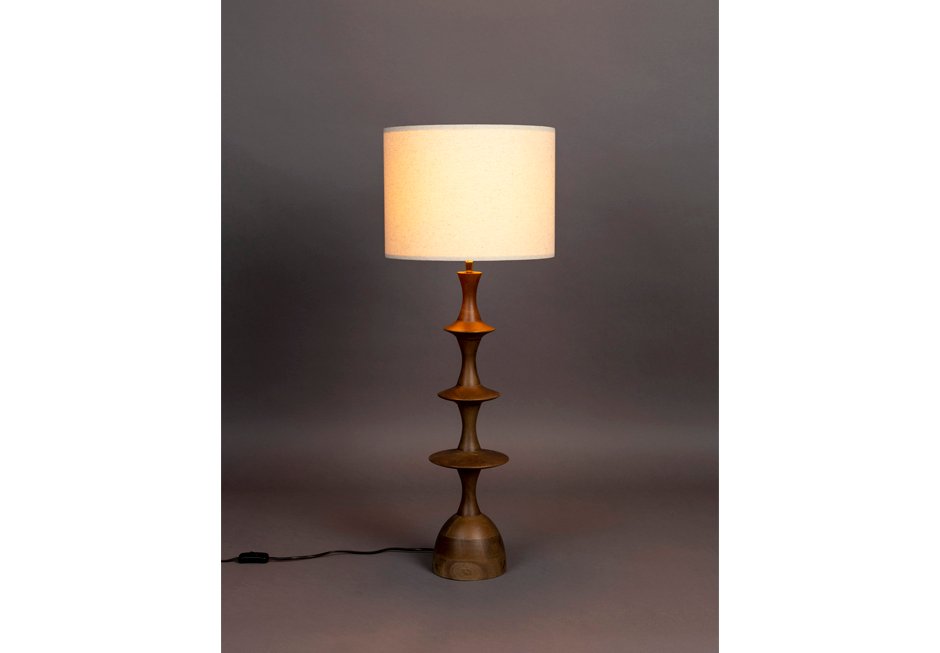 Επιτραπέζιο φωτιστικό με βάση από ξύλο mango και υφασμάτινο καπέλο.