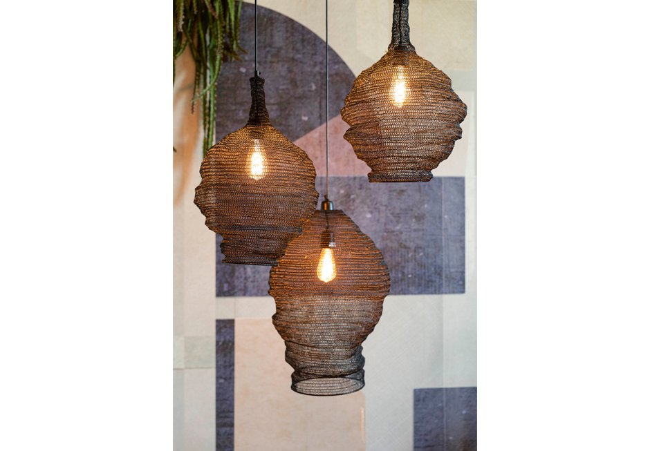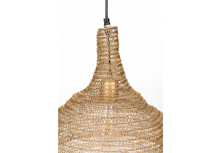 Φωτιστικό οροφής με καλώδιο 100cm και καπέλο από σιδερένιο πλέγμα σε μαύρη και χρυσή απόχρωση.