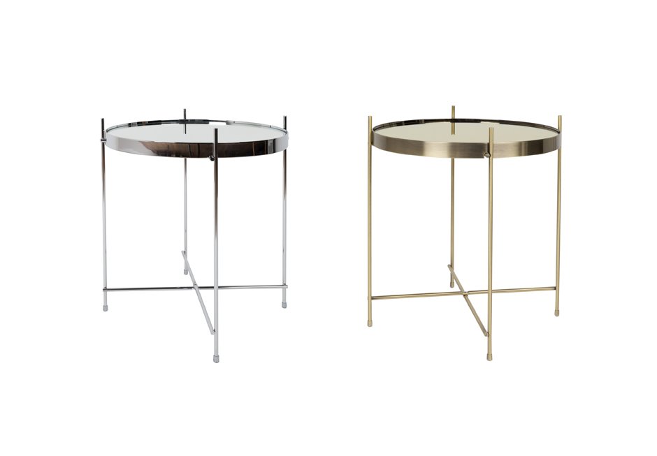 Τραπεζάκι με αποσπώμενο καθρέφτη στην επιφάνεια και αναδιπλούμενη σιδερένια επιχαλκωμένη βάση. Διατίθεται σε διαστάσεις Ø43x45h cm.