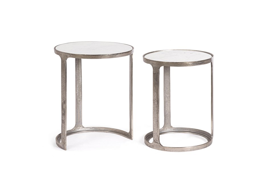 Βοηθητικά τραπεζάκια (σετ των 2) με επιφάνεια μαρμάρου και ασημένια βάση αλουμινίου. Διατίθενται σε διαστάσεις Ø46x56h cm και Ø40x51h cm.