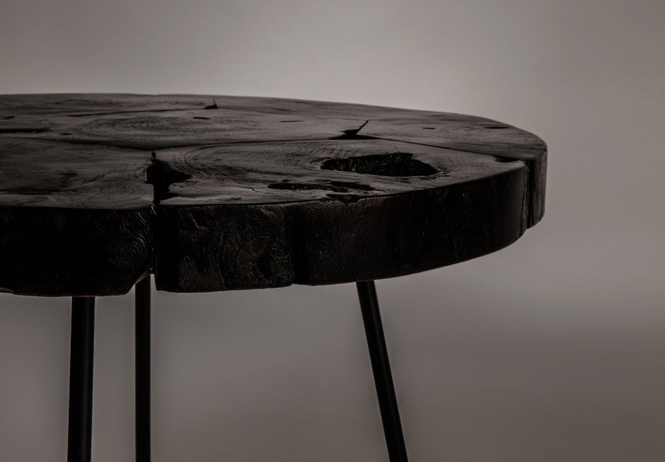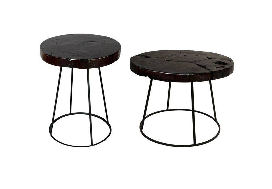 Τραπεζάκια από μεταλλικό σκελετό και επιφάνεια πάχους 50 mm από μασίφ ξύλο τικ σε σκούρα καφέ απόχρωση. Διατίθενται σε διαστάσεις Ø60x44h cm.