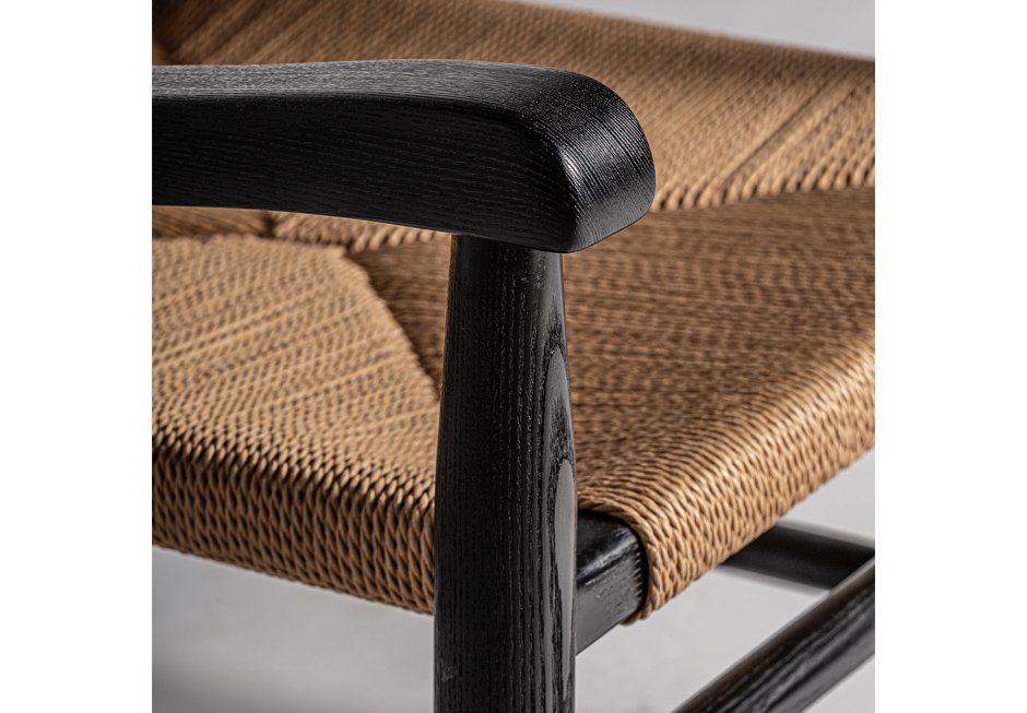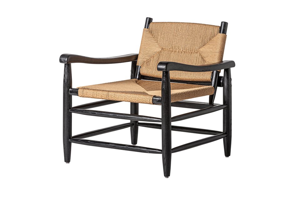 Πολυθρόνα από ανακυκλωμένο καουτσούκ σε μαύρη απόχρωση και πλεκτό κάθισμα. Διατίθεται σε διαστάσεις 66x74x73h cm.