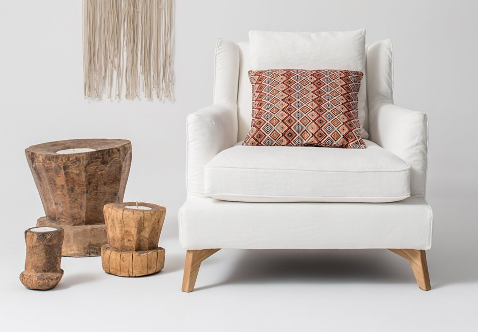 Ντυμένη πολυθρόνα με ξύλινη βάση. Διατίθεται σε διαστάσεις 80×80 cm, σε ποικιλία υφασμάτων, τα οποία αφαιρούνται για καθαρισμό ή αντικατάσταση.