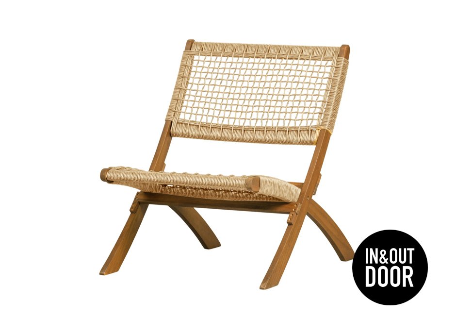 Αναδιπλούμενη πολυθρόνα εσωτερικού και εξωτερικού χώρου, από ξύλο ευκαλύπτου σε φυσική απόχρωση με πλέξη από πολυεστερικό σχοινί. Διατίθεται σε διαστάσεις 78x60x73h cm.
