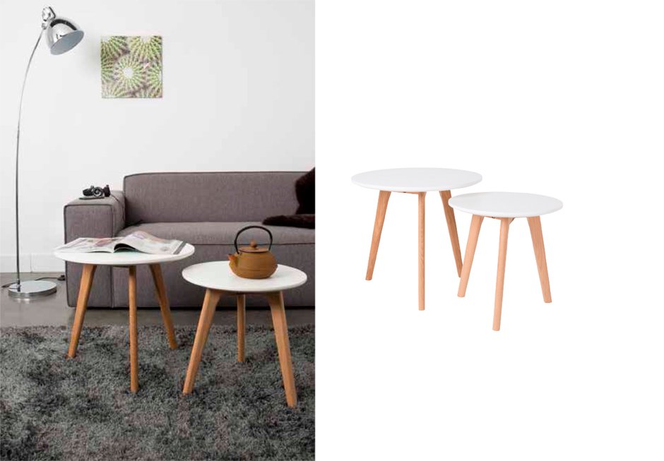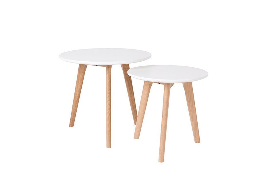 Σετ τραπεζάκια με ξύλινο καπάκι σε λευκή λάκα και πόδια από μασίφ δρυ. Διατίθεται σε διαστάσεις,