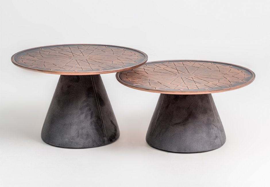 Τραπεζάκια (σετ 2τμχ) από μεταλλική εγχάρακτη επιφάνεια στην απόχρωση του χαλκού, και ντυμένη βάση με βελούδο σε γκρι χρώμα. Διατίθενται σε διαστάσεις Ø75x36h cm και Ø75x43h cm.