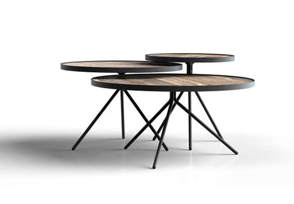 Τραπεζάκια (σετ των 3) από ξύλο δρυς. Διατίθενται σε διαστάσεις Ø75x37h cm, Ø60x42h cm και Ø45x47h cm.
