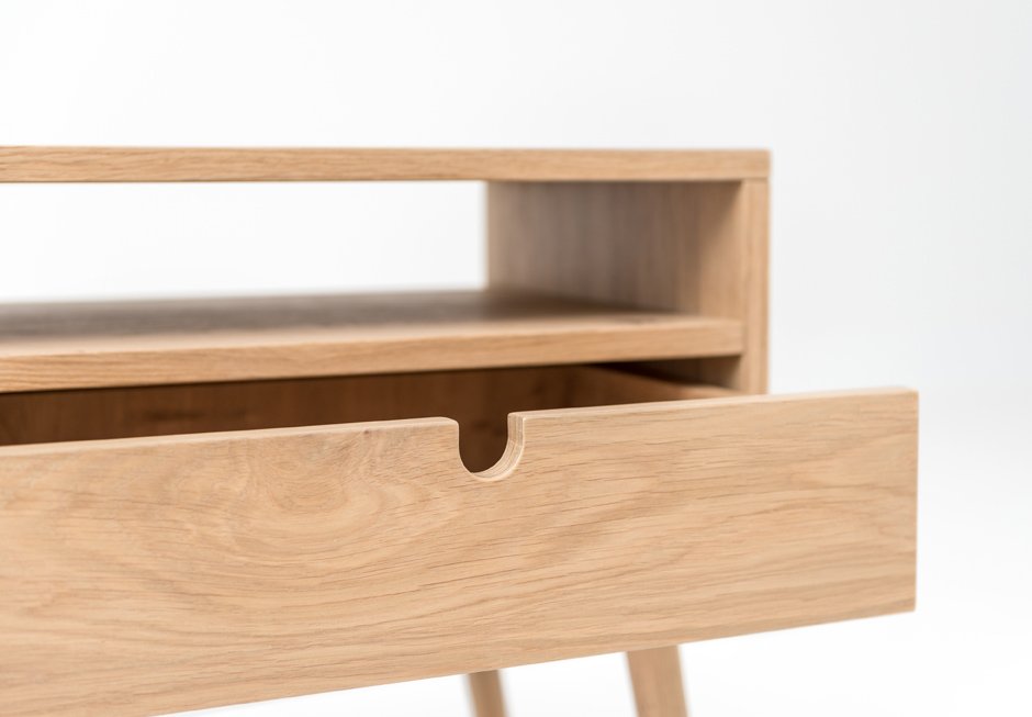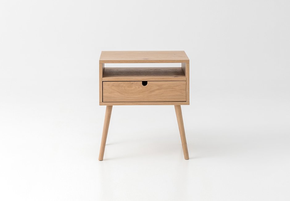 Κομοδίνο από δρυς με συρτάρι και ράφι για αποθηκευτικό χώρο. Διατίθεται σε διαστάσεις 52x40x58h cm. Κατόπιν παραγγελίας σε ποικιλία υλικών, χρωμάτων και διαστάσεων.