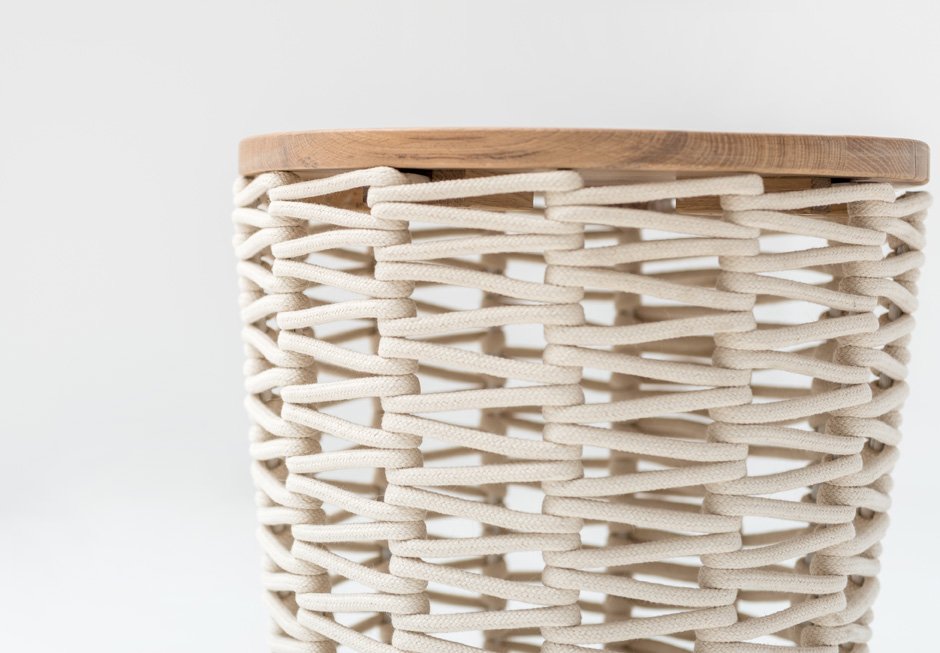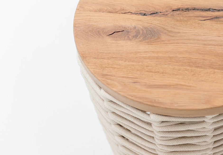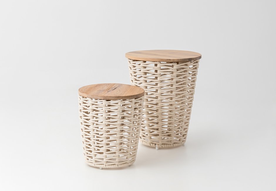 Κομοδίνο από μασίφ δρυς ξύλινη επιφάνεια και μεταλλική βάση με χειροποίητη πλέξη σε εκρού χρώμα. Διατίθεται σε διαστάσεις Ø38-Ø42×46.5h και Ø46-Ø52×61.5h cm.