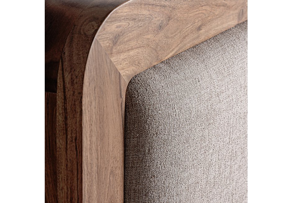 Κρεβάτι με σκελετό από ξύλο ακακίας για στρώμα 180×200 cm. Διατίθεται με μπεζ επένδυση από ακρυλικό και polyester.