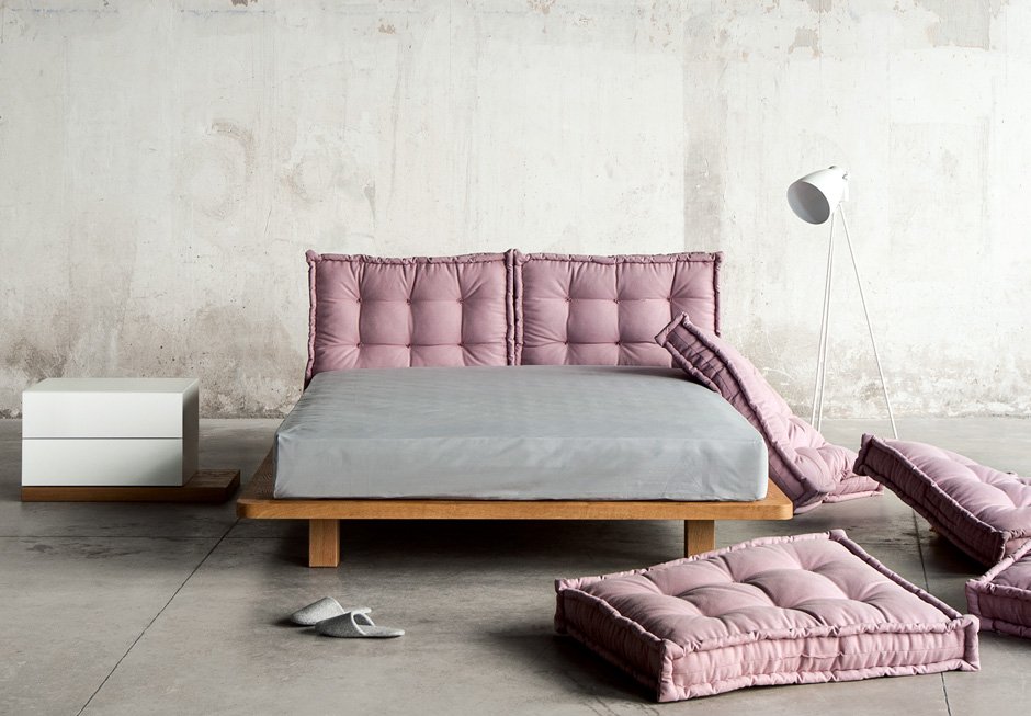 Κρεβάτι με ξύλινη μασίφ βάση από δρυ, για στρώμα 160×200 cm. Το κεφαλάρι αποτελείται από χειροποίητες μαξιλάρες. Διατίθεται σε ποικιλία υφασμάτων και χρωμάτων καθώς και διαφορετικών διαστάσεων ανάλογα το στρώμα. Κατόπιν παραγγελίας διαθέτει αποθηκευτικό χώρο.