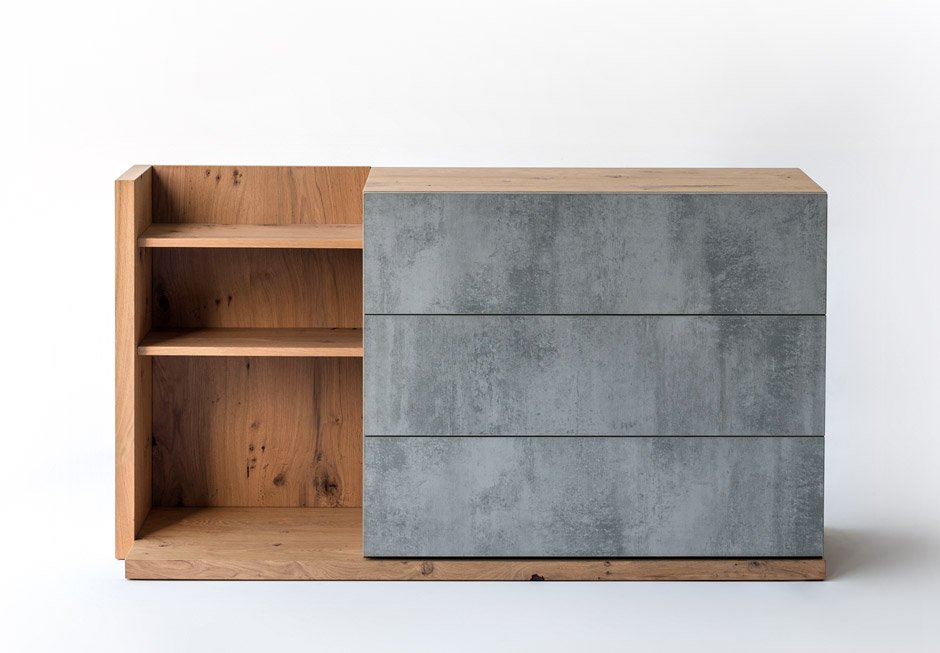 Συρταριέρα από δρυς rustic ξύλο βάση και ράφια, με φόρμικα μπετόν συρτάρια σε διαστάσεις 128x45x77h cm. Κατόπιν παραγγελίας σε ποικιλία διαστάσεων, υλικών και χρωμάτων.