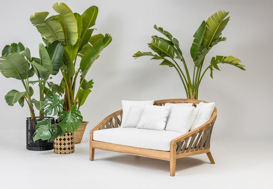 Daybed / καναπές από μασίφ ξύλο και πλέξη από ιμάντες στην πλάτη του καθίσματος. Διατίθεται σε διαστάσεις 160x120x85h cm, από την αρχική τιμή 5.500€ στην τελική τιμή προσφοράς 1.925€.