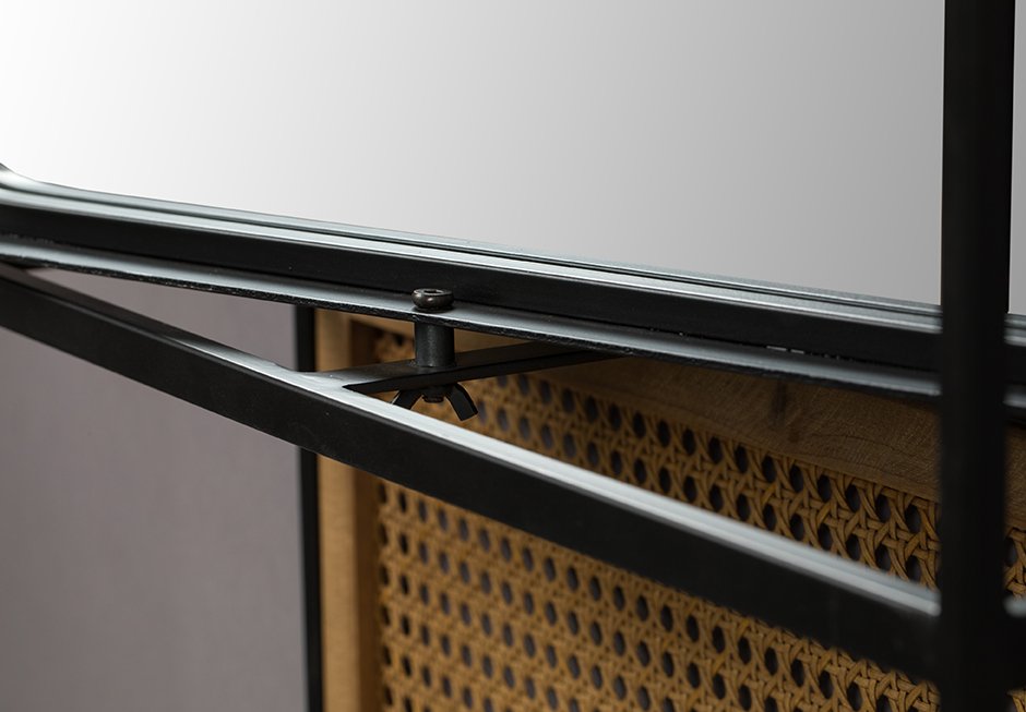 Επιτοίχιος καθρέπτης από μεταλλικό σκελετό και rattan. Διατίθεται σε διαστάσεις: 53x15x165h cm, μεγάλος περιστρεφόμενος καθρέφτης με ράφι.