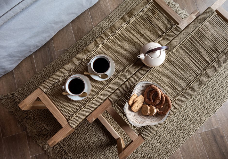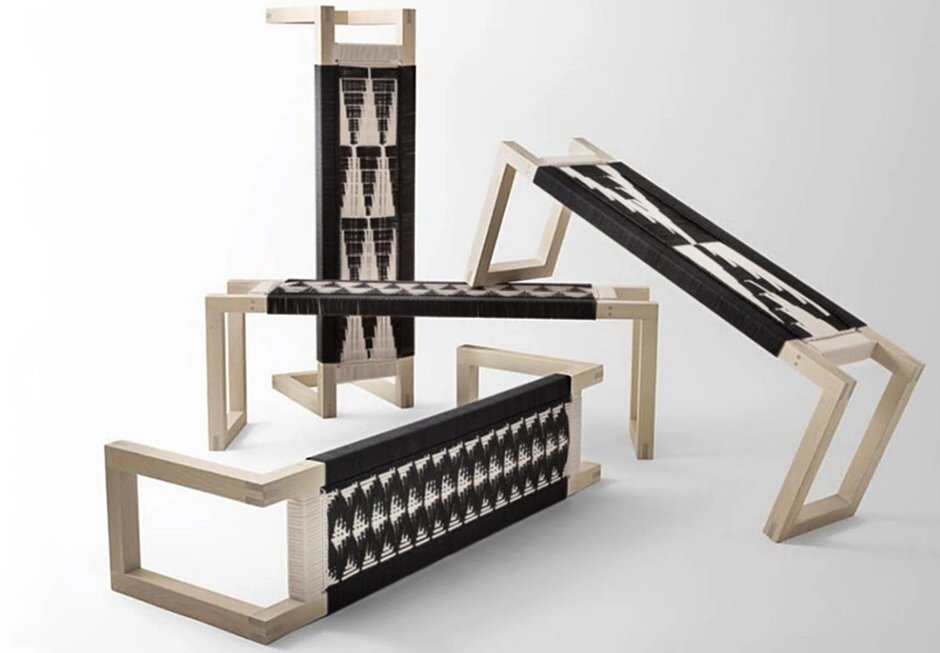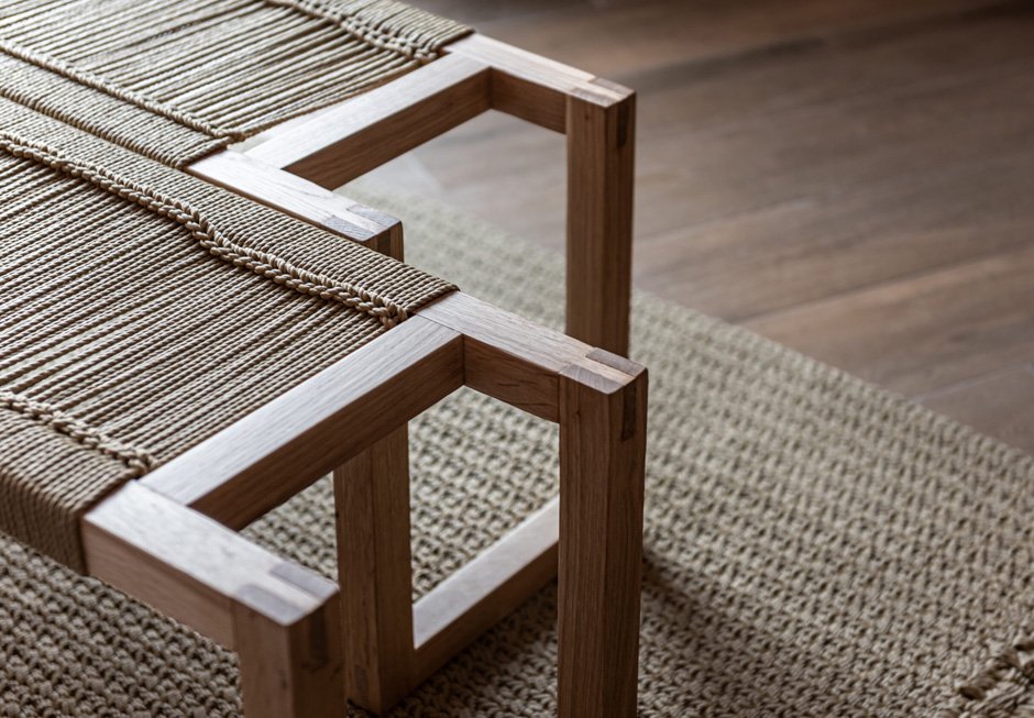 Σκαμπό/ταμπουρέ από ξύλινο σκελετό και πλεκτό χειροποίητο κάθισμα μακραμέ.