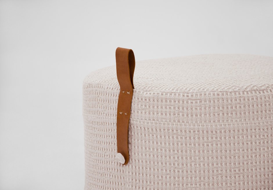 Πουφ με ύφασμα και δερμάτινη λεπτομέρεια.
