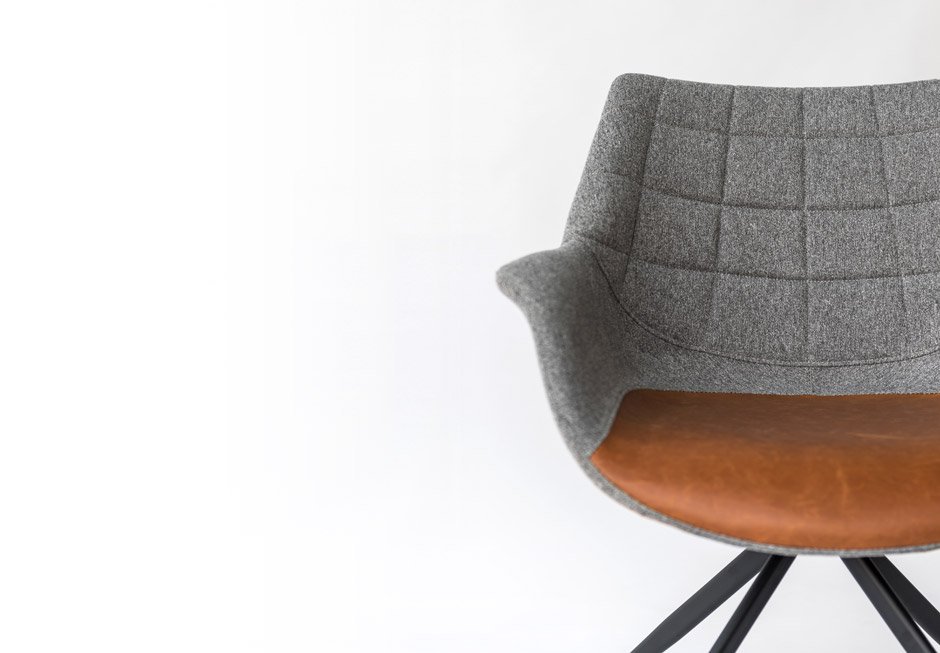 Πολυθρόνα από γκρι ύφασμα με λεπτομέρεια από τεχνόδερμα και μεταλλική βάση. Διατίθεται σε διαστάσεις 87.5x84x57h cm, με ύψος καθίσματος 42 cm, βάθος καθίσματος 51 cm και ύψος μπράτσου 57 cm.