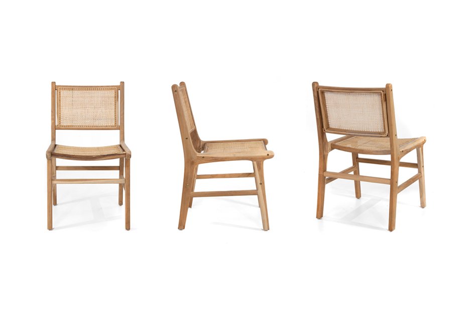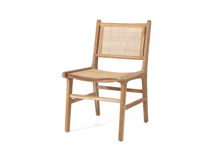 Καρέκλα, κατάλληλη για εσωτερικό και για στεγασμένο εξωτερικό χώρο, από ξύλο teak με πλέξη από rattan στην πλάτη και στο κάθισμα. Διατίθεται σε διαστάσεις 50x60x88h cm.